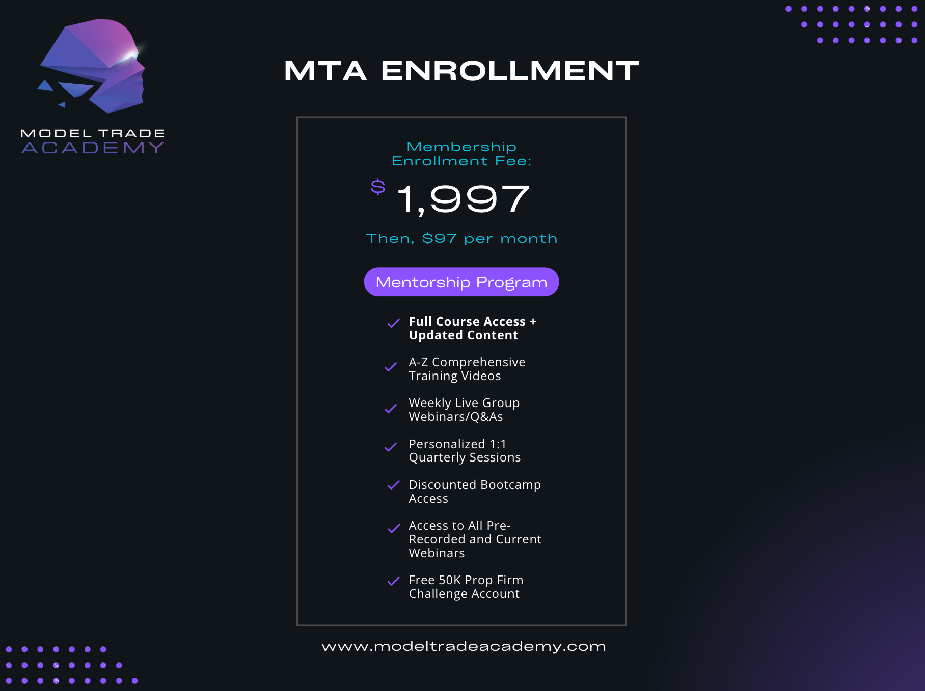 Disclaimer: The information provided on this site should not be interpreted as investment advice. Model Trade Academy is an educational mentorship program. Trading involves risk and is not suitable for everyone. Past performance and testimonials do not guarantee future results. Participation in MTA does not promise profitability. Members are responsible for their own trading decisions. Always consider your financial situation before trading. It is recommended to seek advice from a certified financial professional who can provide personalized guidance tailored to your specific needs. No Liability: By accessing and using the site, you acknowledge and accept that you are solely responsible for any investment decisions and their outcomes.