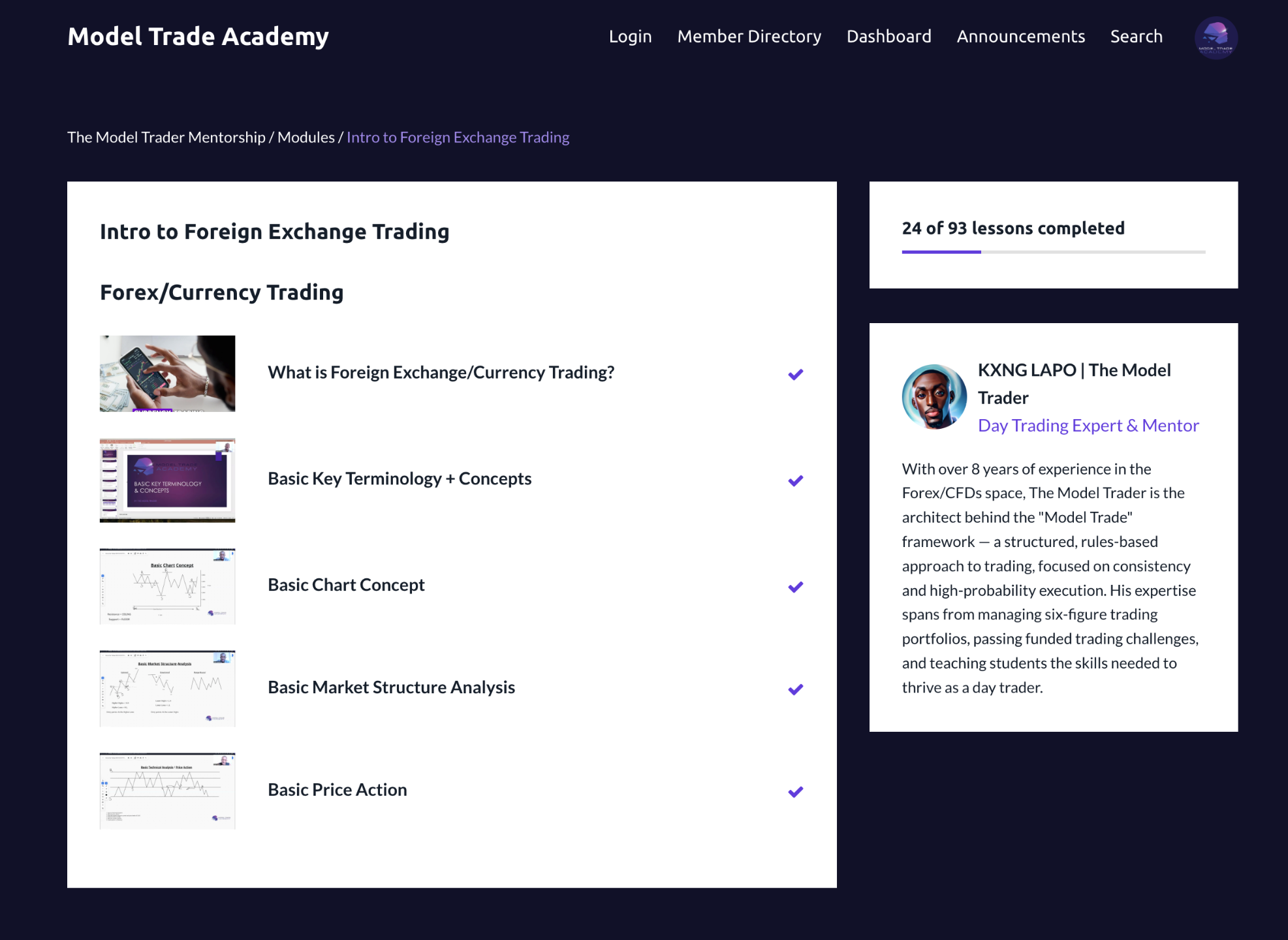 With over 8 years of experience in the Forex/CFDs space, Kxng Lapo is the architect behind the "Model Trade" framework — a structured, rules-based approach to trading, focused on consistency and high-probability execution. His expertise spans from managing six-figure trading portfolios, passing funded trading challenges, and teaching students the skills needed to thrive as a day trader.